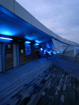 附帶一提,如果白天的橫濱山手地區充斥著滿滿的寫生老人的話,那傍晚的大棧橋上就是聚集了滿滿的攝影大叔了!扛著鏡頭、背著配備,聚精會神地拍著橫濱港、海、船、要亮不亮的夜景。附帶再提,大棧橋的燈光設計實在很吊詭,為什麼會出現這麼幽微的宇宙藍光呢!簡直就是異次元空間的扭曲光束吧!